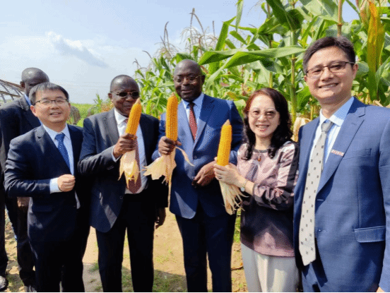 严建兵校长与刚果(布)农牧渔业部部长保罗•华伦亭•恩戈博等在玉米团队试验田