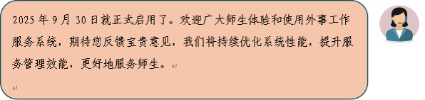 该系统以满足师生实际需求为导向,聚焦外事业务办理中的核心痛点,将“优化办事流程、简化信息填报、提升工作效率”作为核心建设目标,通过操作便捷化、服务智能化的设计,致力于为全校师生提供更具人性化、更高效便捷的外事业务办理新体验,切实打通服务师生的“最后一公里”。