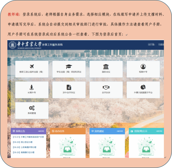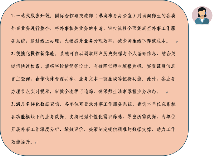 为更好践行“服务师生”核心宗旨,国际合作与交流部(港澳事务办公室)依托数字智慧赋能外事服务升级,精心打造的外事工作服务系统现已正式上线运行。